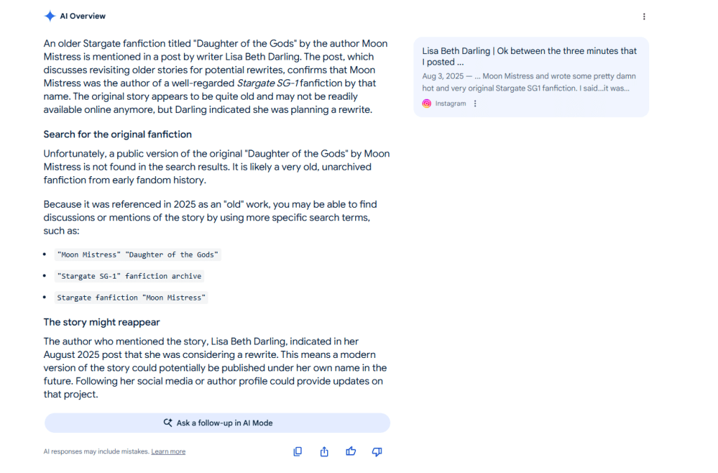 When I mentioned wanting to rewrite these two stories just a short time ago, I did go look for them online. I stated that here and I looked hard. When I left the Stargate SG-1 fandom I needed it to be a totally clean break so I took it down or asked for every single story that was archived anywhere that I knew of (hahaha) to be removed. Every story in the “Daughter of the Gods” series was supposed to…poof…vanish….buh-bye.