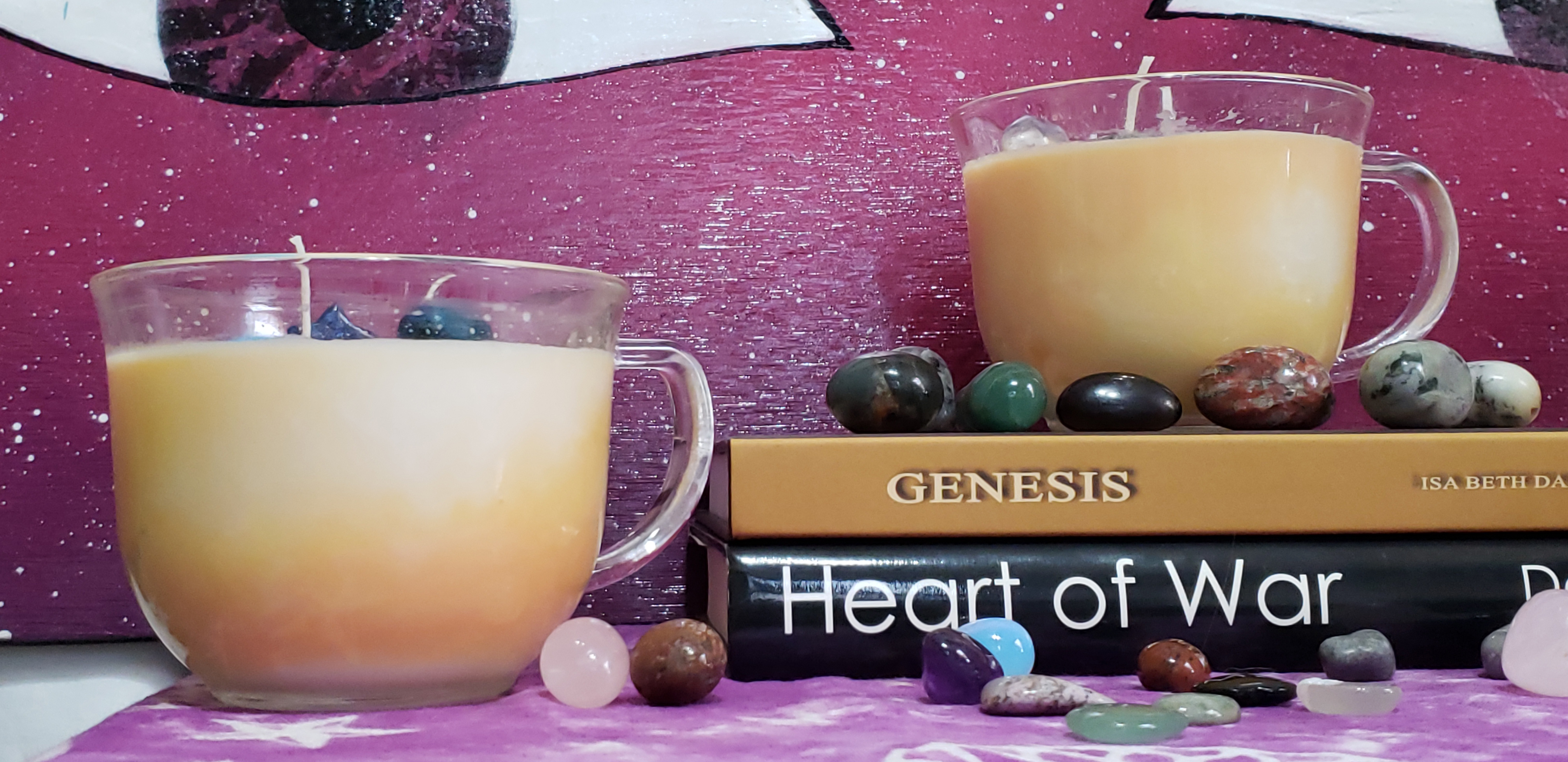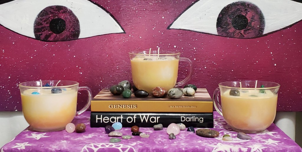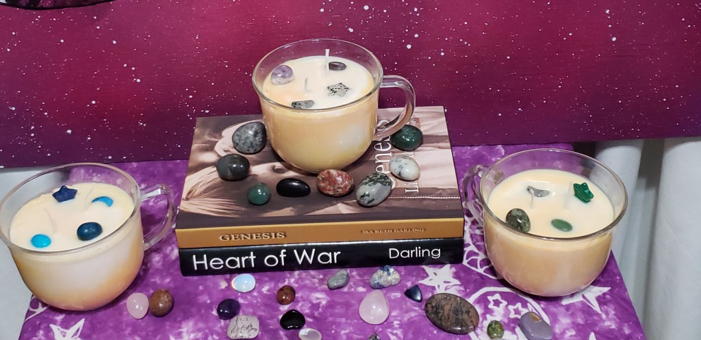 This collection of 3 finely crafted candles was hand decorated and poured on the Harvest Moon of October 6, 2025. They were blessed and charged under the silvery light of the Hunter’s Moon. My methods for making these candles ensure that all are unique and that they can never be exactly duplicated. The finished design is determined by Fate. Each is crowned with 4 polished/shaped stones suitable for your collection.