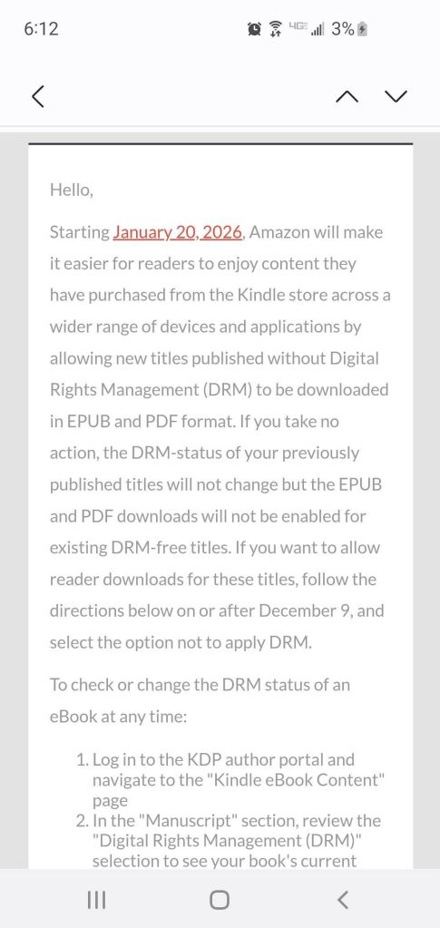 I hit the DRM box and hit ‘publish’ just as fast as it would let me. KDP wanted me to be sure I didn’t want my stuff thrown into these new formats.