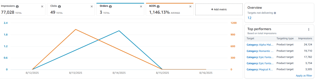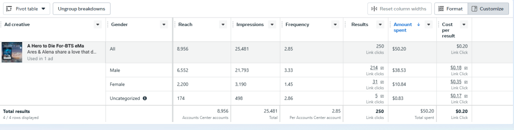 While we didn’t make our money back we did get a lot of useful info. Like….don’t bother with Amazon ads. Advertise elsewhere but not with the expectation of making your money back and don’t spend more than you can very comfortably afford, it’s just not worth it. On Amazon, I “coat tailed” on some pretty well known authors and upped my bids for those clicks, while I got 77,000 impressions only 49 people clicked it…out of 77,000! You’re better off at the casino or buying lottery tickets.