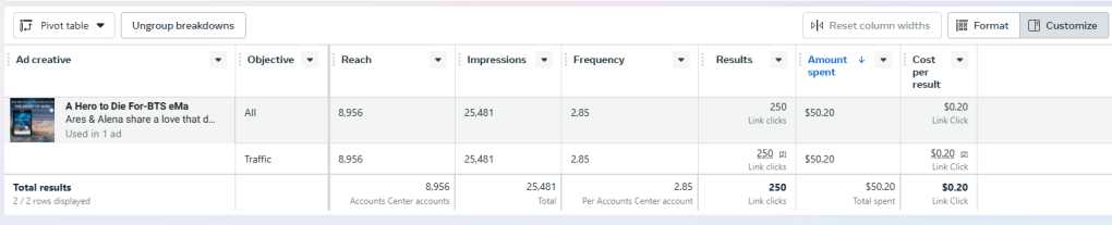 The FB/Meta add garnered me 250 clicks with just under 9,000 impressions! (That’s just a fancy way of saying how people actually SAW your ad. That’s all.)