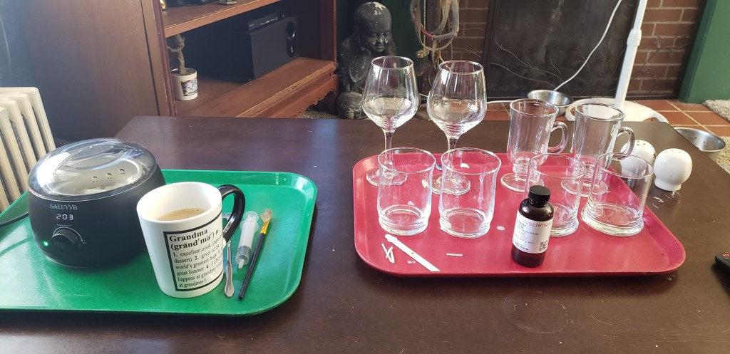 Before this, I bought a few scents from CandleScience and I highly recommend them. I also bought a slab of coconut wax to work with. Hubby gave me a candle kit for my birthday so I have this neat little melting pot now and, for the first time, block dye. Love it! The liquid is nice too, it all just depends on the wax you’re using and the color you want to end up with. This electric melting pot is not good for making candles but it’s an awesome Boo-Boo Pot. Keep fresh undyed, unscented wax in it, and when I come up a bit short, pour it in to fill the candle the rest of the way. It also makes a fantastic Decorating Pot as it got me out of the kitchen and into my comfy living room where I could watch murder mysteries as I worked on the first stage of the project.