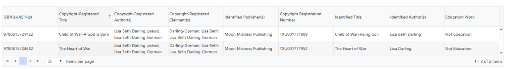 Each line in the Works List represents one claimable work and that work is ultimately identified by the copyright registration number. The copyright registration number TXU001771989 is associated with Child of War – A God is Born, therefore Child of War – A God is Born is the relevant claimable work. The title Child Of War – Rising Sun was mistakenly included in Identified column of the Works List and the ISBN column.