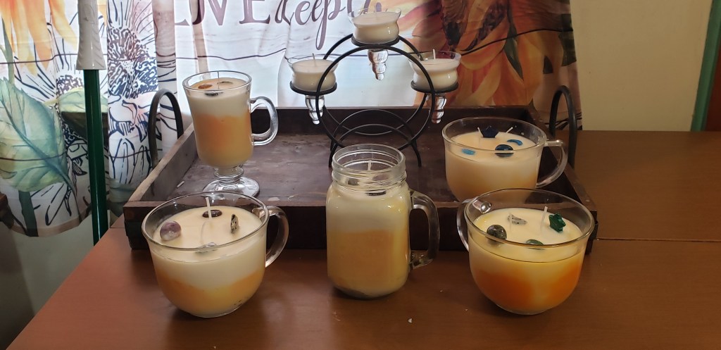 That caddy with the 3 candles has been sitting on a shelf over the stairs collecting dust for years. It made its way downstairs. It got nicely cleaned up and I wanted to use it but votive candles are a PITA in that thing. I poured directly into the glass, hoping it wasn’t going to shatter because it’s rather thin. Came out pretty good. The others are all kind of happy Autumn-y maybe sunset-y and are cinnamon/vanilla or just cinnamon.
